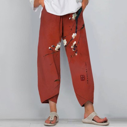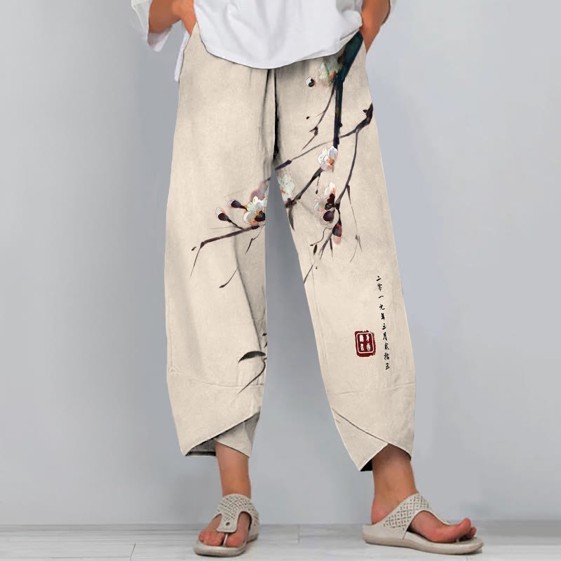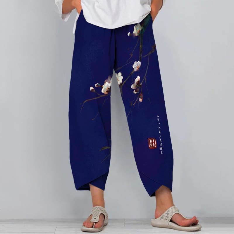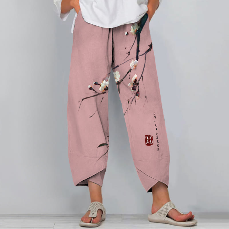 Dashingsoul Vintage Plum Blossom Art Print Drawstring Pocket Women's Pants