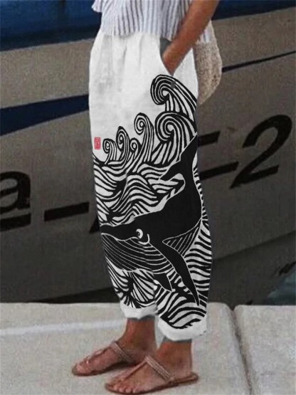 Whale & Waves Japanese Lino Art Casual Pants