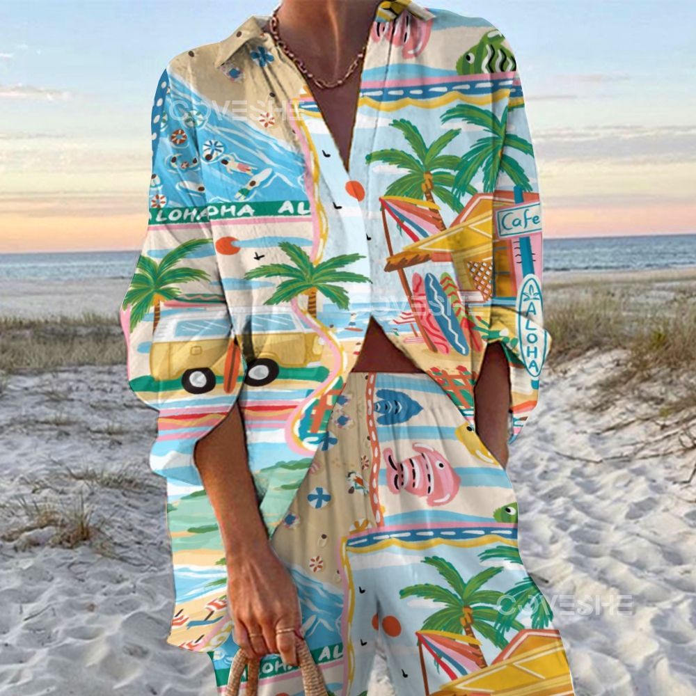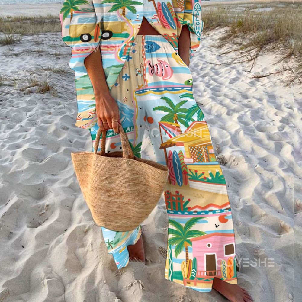 Women's Beach Cartoon Fish Printed Shirt & Pants Two-piece Set