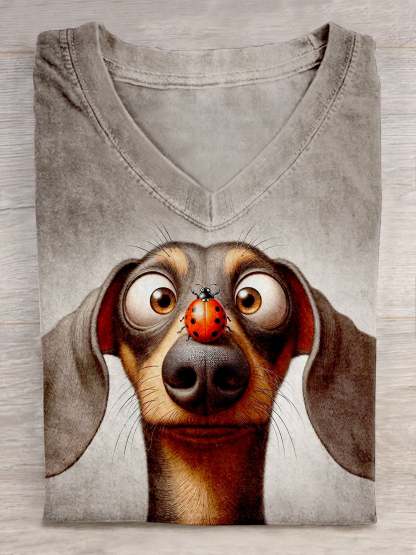 Women's Dachshund And Ladybird Art Print V-neck Casual T-Shirt