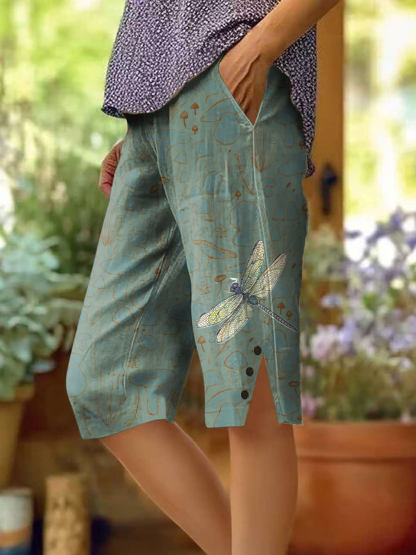 Women's Dragonfly Mushroom Art Print Cotton And Linen Casual Pants