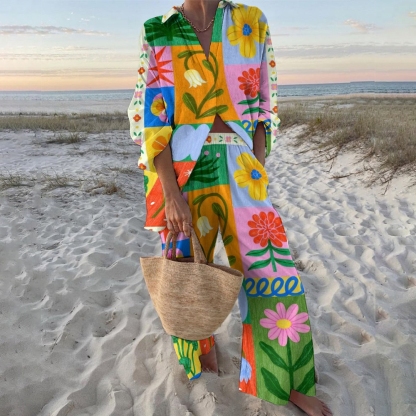 Women's Flower Splicing Printed Shirt & Pants Two-piece Set