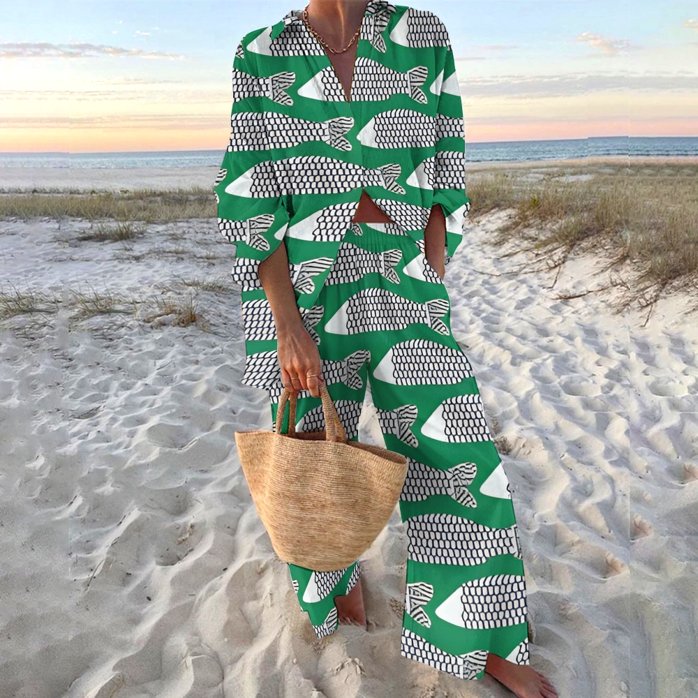 Women's Geometric Fish Printed Shirt & Pants Two-piece Set