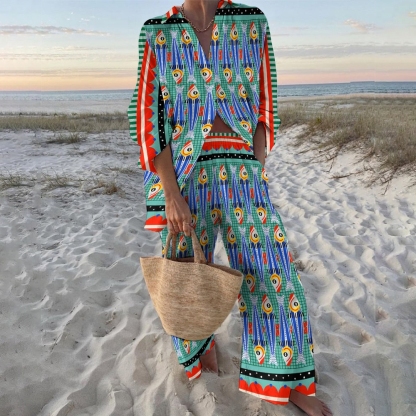 Women's Geometric Fish Printed Shirt & Pants Two-piece Set