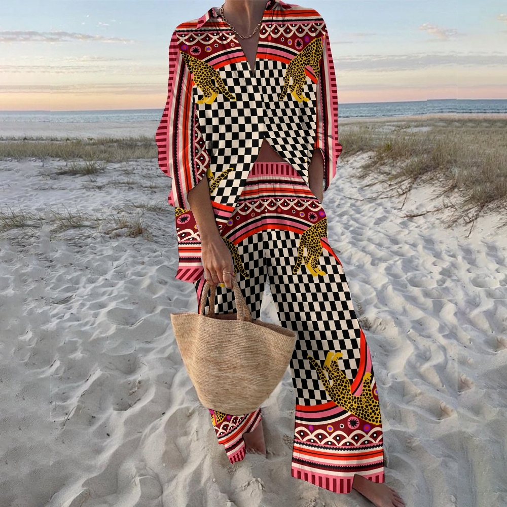 Women's Geometric Leopard Printed Shirt & Pants Two-piece Set