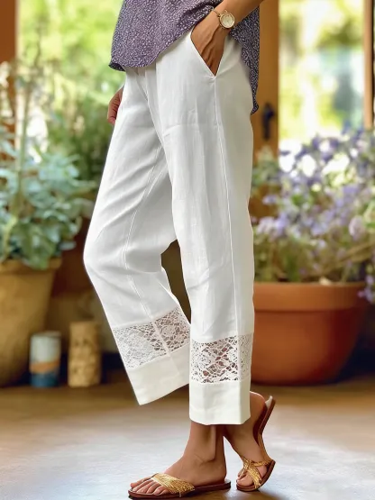 Women's Retro Casual Early Spring Lace Splicing Cotton Linen Casual Pants