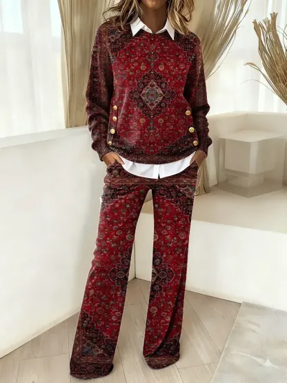 Women's Vintage Ethnic Pattern Art Print Cotton Knit Set