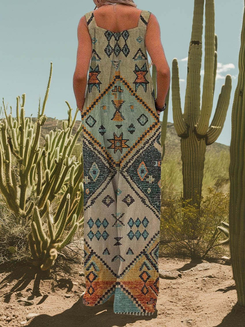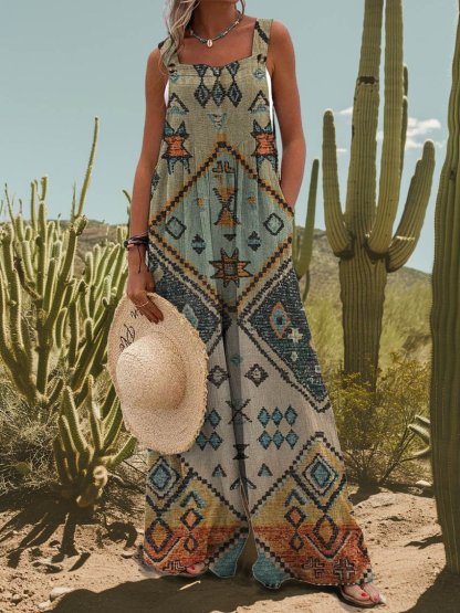 Women's Vintage Pattern Print Casual Strap Wide Leg Pants