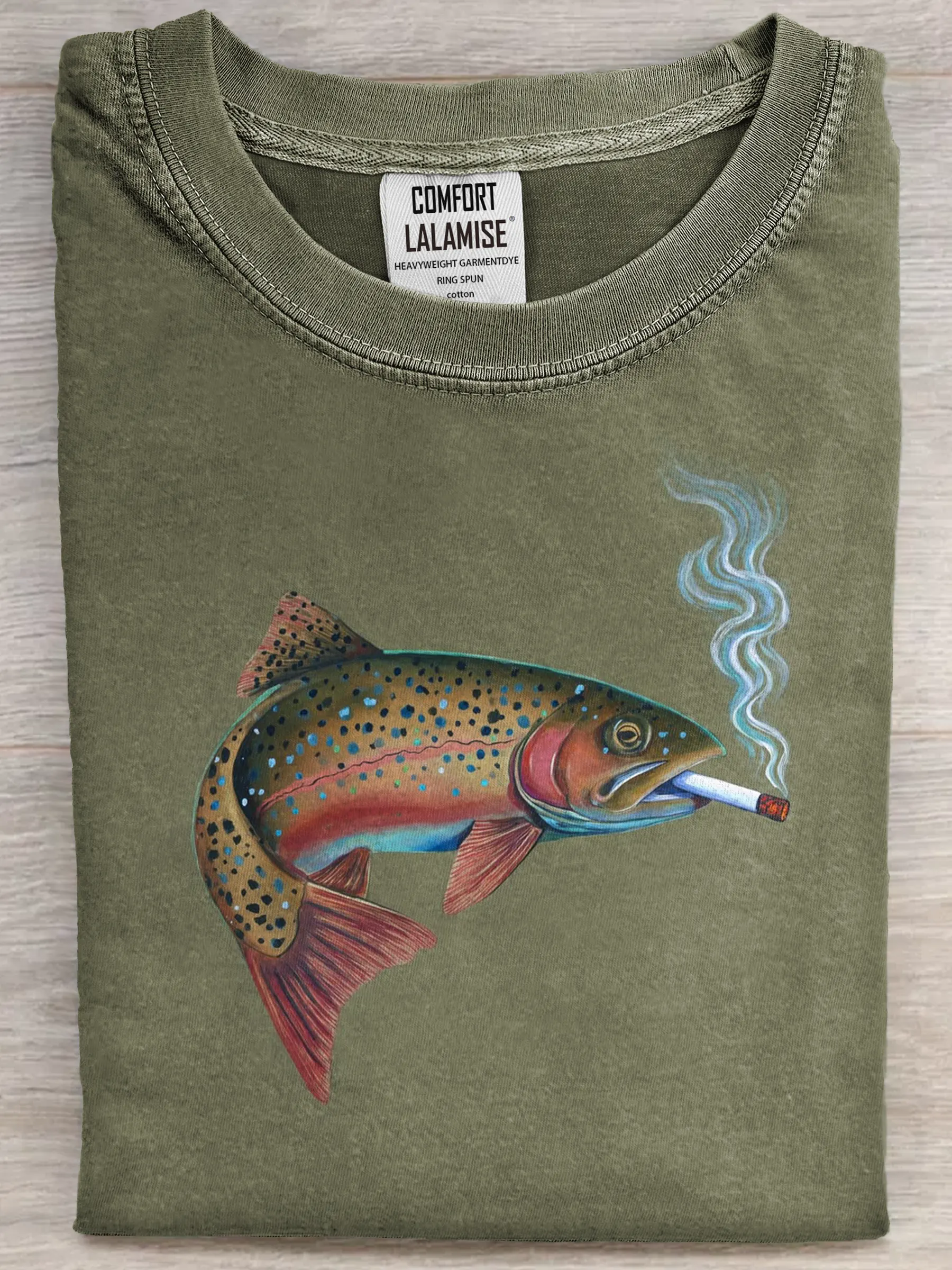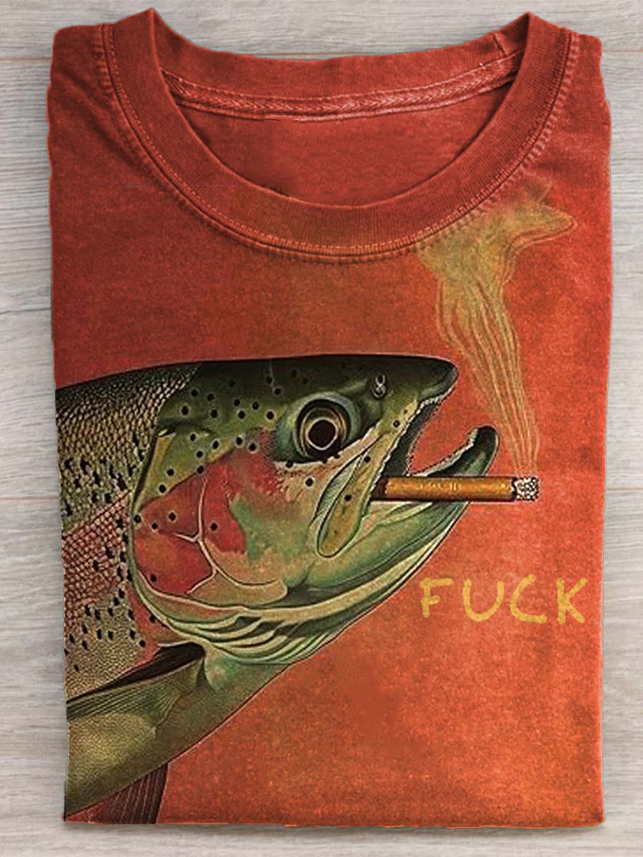 Funny Smoking Fish Art Print Casual Cotton Short Sleeve T-shirt