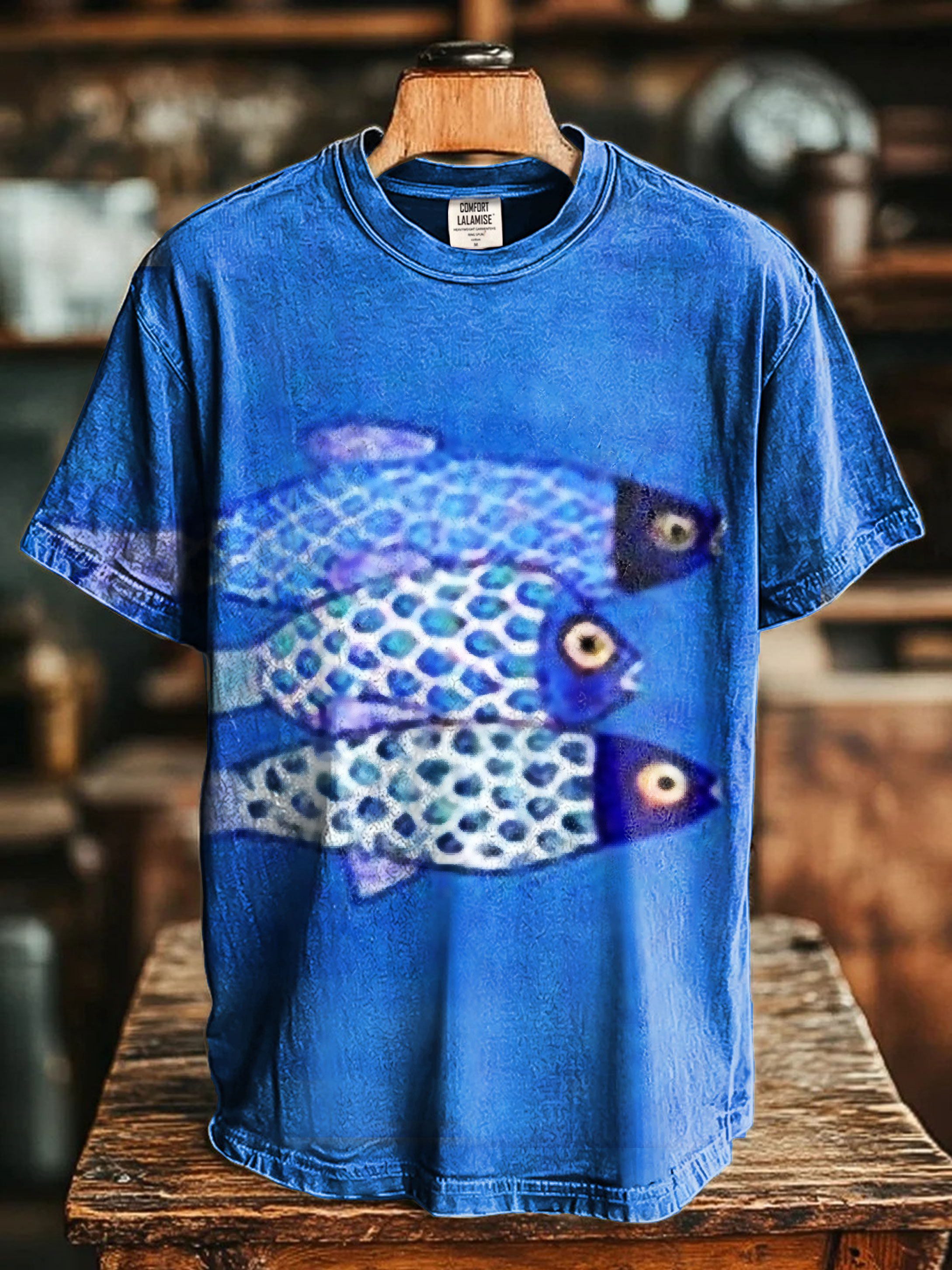 Retro Fish Fun Art Print Casual Pure Cotton Short Sleeved T-shirt
