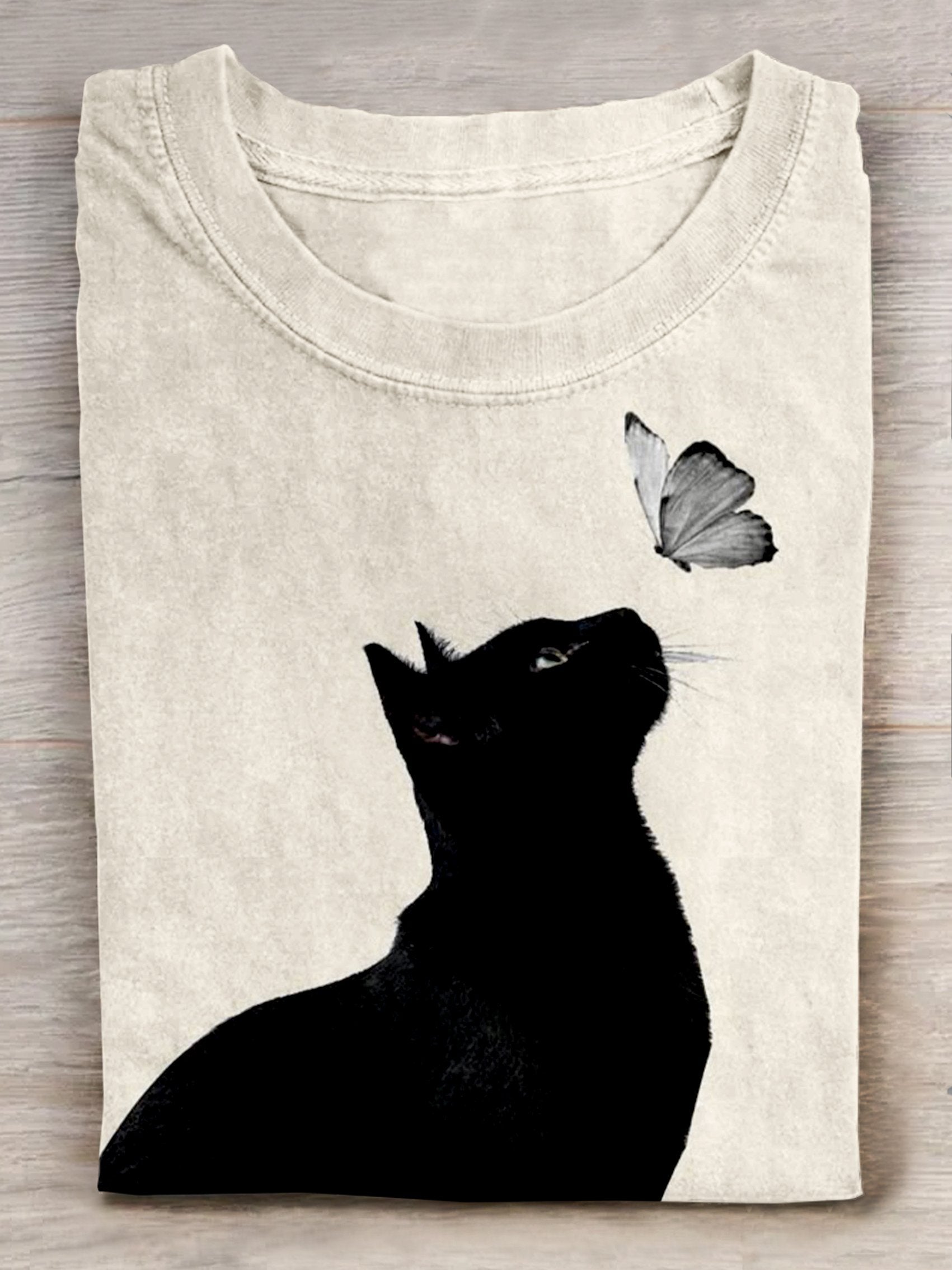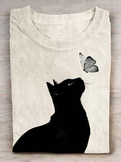 Black Cat And Butterfly Art Print Casual Short Sleeve T-shirt