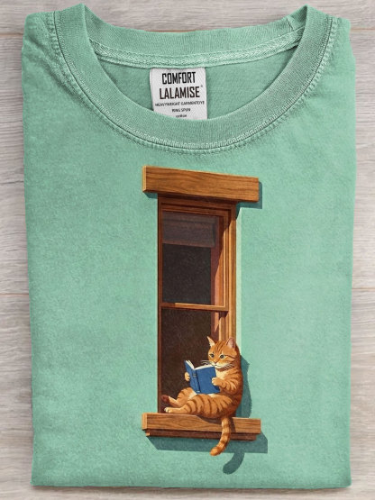 Cat And Book Lover Art Print Casual Short Sleeve T-shirt