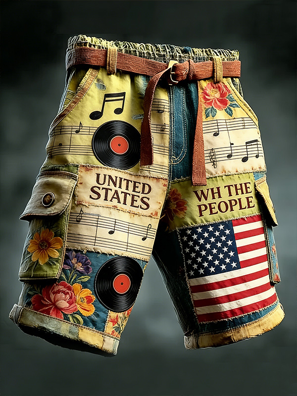 Men's Retro United States Flag Music Flowers Print Denim-Like Cargo Shorts