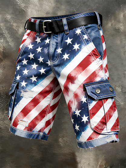 Men's Stars Stripes American Flag Print Denim-Like Cargo Shorts