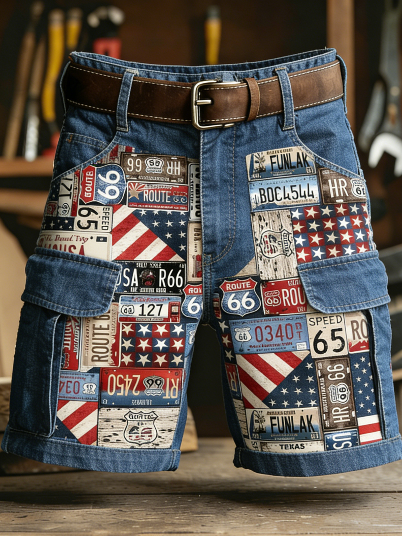 Men's USA Flag Route 66 License Plate Art Print Denim-Like Casual Shorts