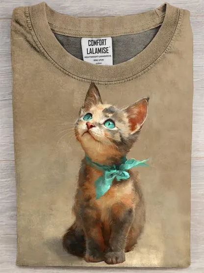 Retro Fun Cat Art Print Casual Pure Cotton Short Sleeved T-shirt