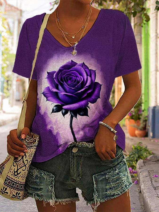 Women's Alzheimer's Awareness Purple Rose Print V-Neck T-Shirt