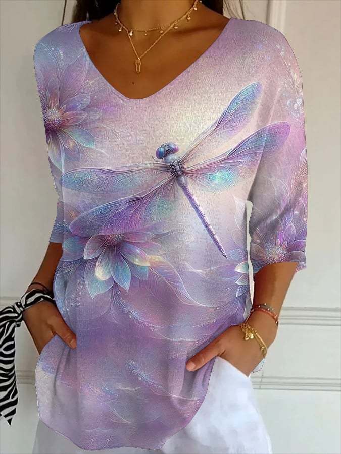 Women's Casual Purple Art Retro Floral Dragonfly Striped Top
