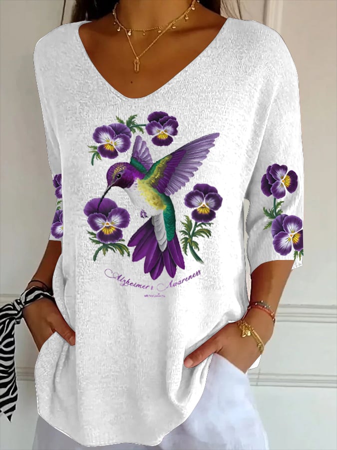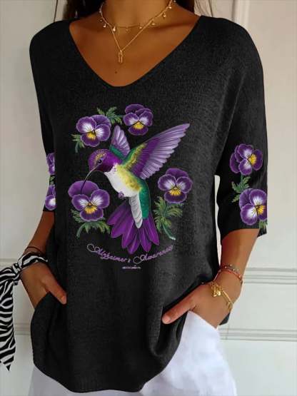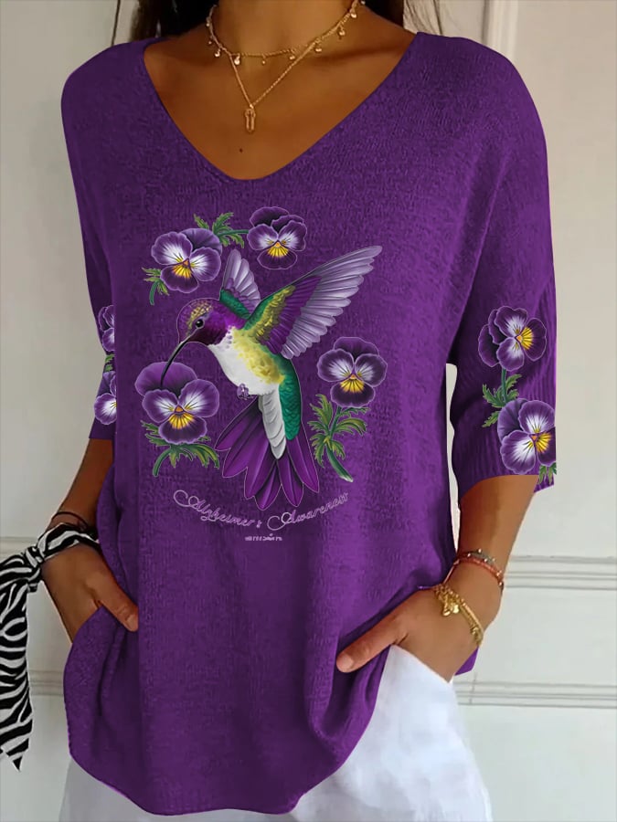 Women's Casual Retro Purple Art Floral Striped Top