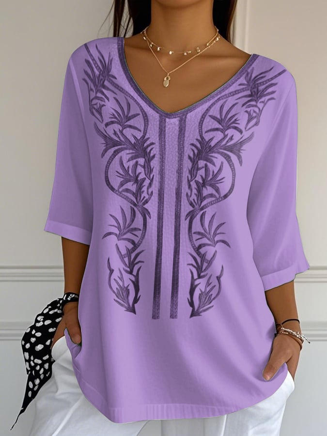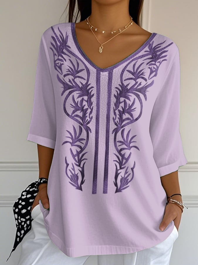 Women's Embroidered V-Neck Faux Linen Printed Casual Top