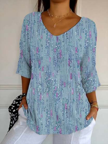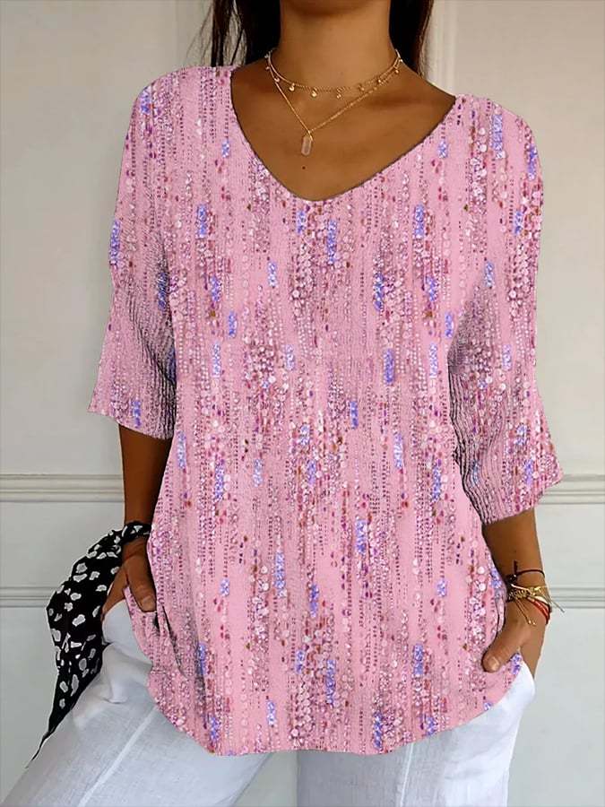 Women's Artistic Design Printed Ribbed Fabric Casual V-Neck Mid-Sleeve T-Shirt