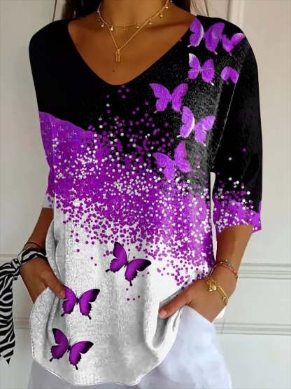 Buy 3 Get 10% OffWomen's Purple Butterfly Print Striped Fabric Casual V-Neck T-Shirt – lolonb