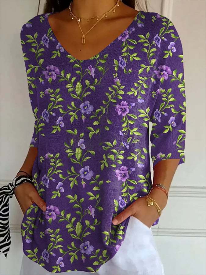 Buy 3 Get 10% OffWomen's Purple Floral Print Striped Fabric Casual V-Neck T-Shirt – lolonb