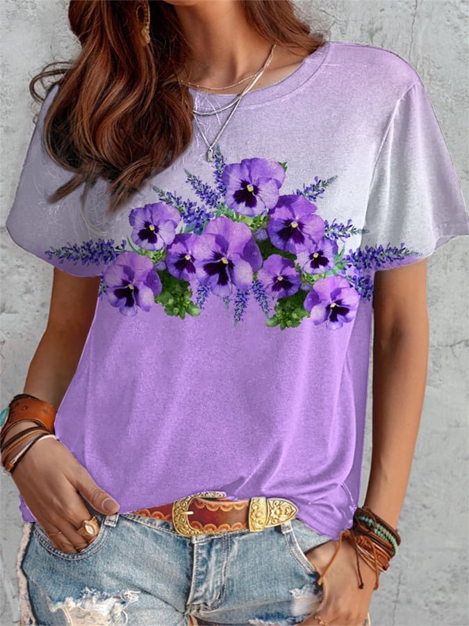 Women's Purple Flower Alzheimer's Awareness Support Printed T-Shirt