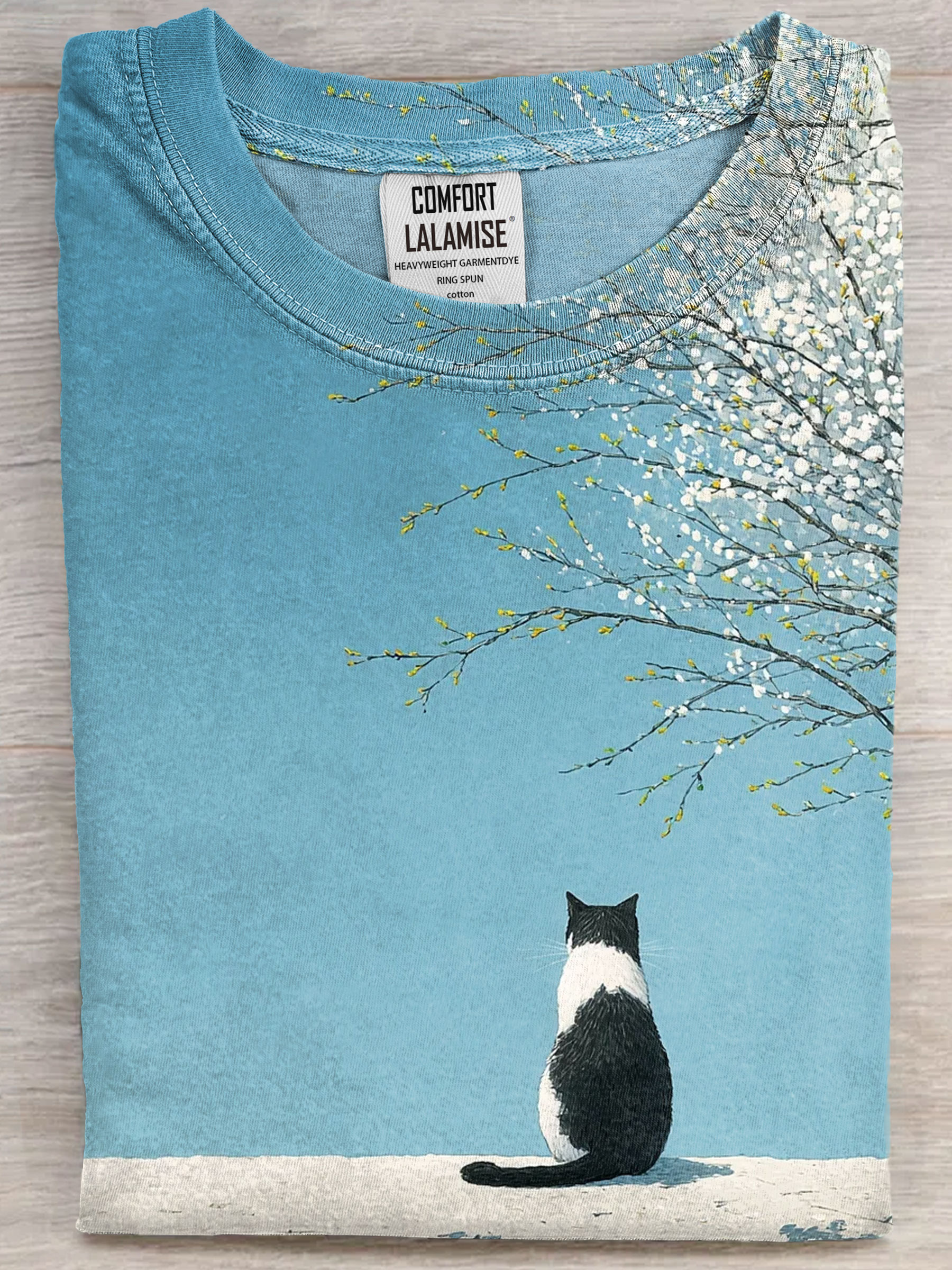 Retro Fun Cat Art Print Casual Pure Cotton Short Sleeved T-shirt