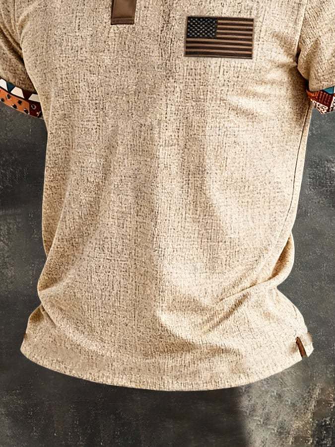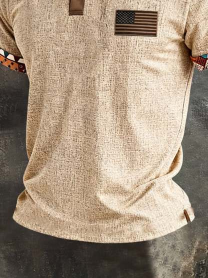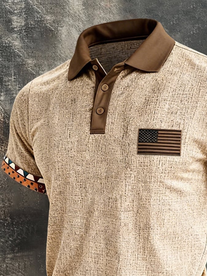 Men'S Retro Color-Block "Patriot" Polo-Collar Casual Cotton-Linen T-Shirt
