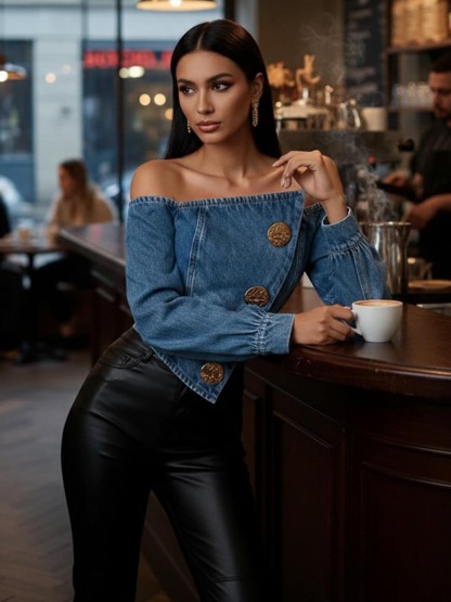 Buttoned Pleated Solid Color Split-Joint Irregularity Long Sleeves Off-The-Shoulder Blouses&Shirts Tops
