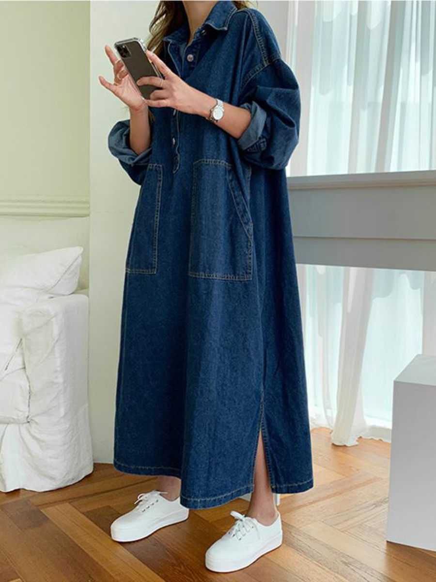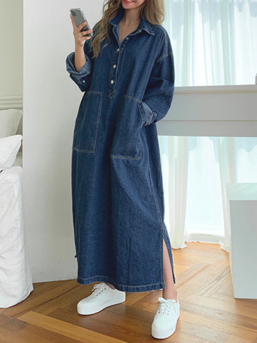 Buttoned Pockets Solid Color Split-Joint Split-Side Long Sleeves Loose Lapel Shirt Dress Maxi Dresses – lolonb