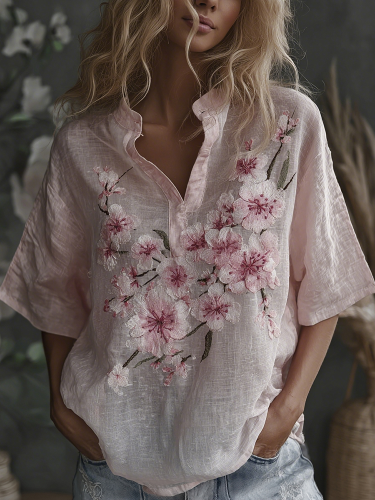 Vintage Sakura Flower Embroidered Short Sleeve Stand Collar Linen Shirt