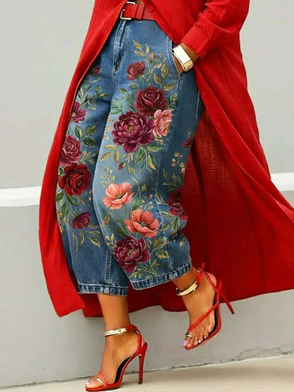 Women's Retro Floral Pattern Art Print Casual Jeans – lolonb