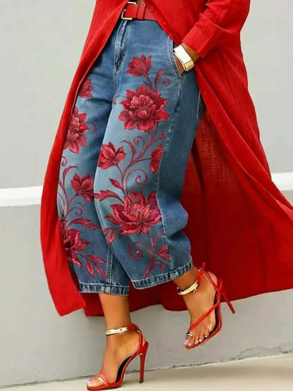 Women's Retro Floral Pattern Art Print Casual Jeans – lolonb