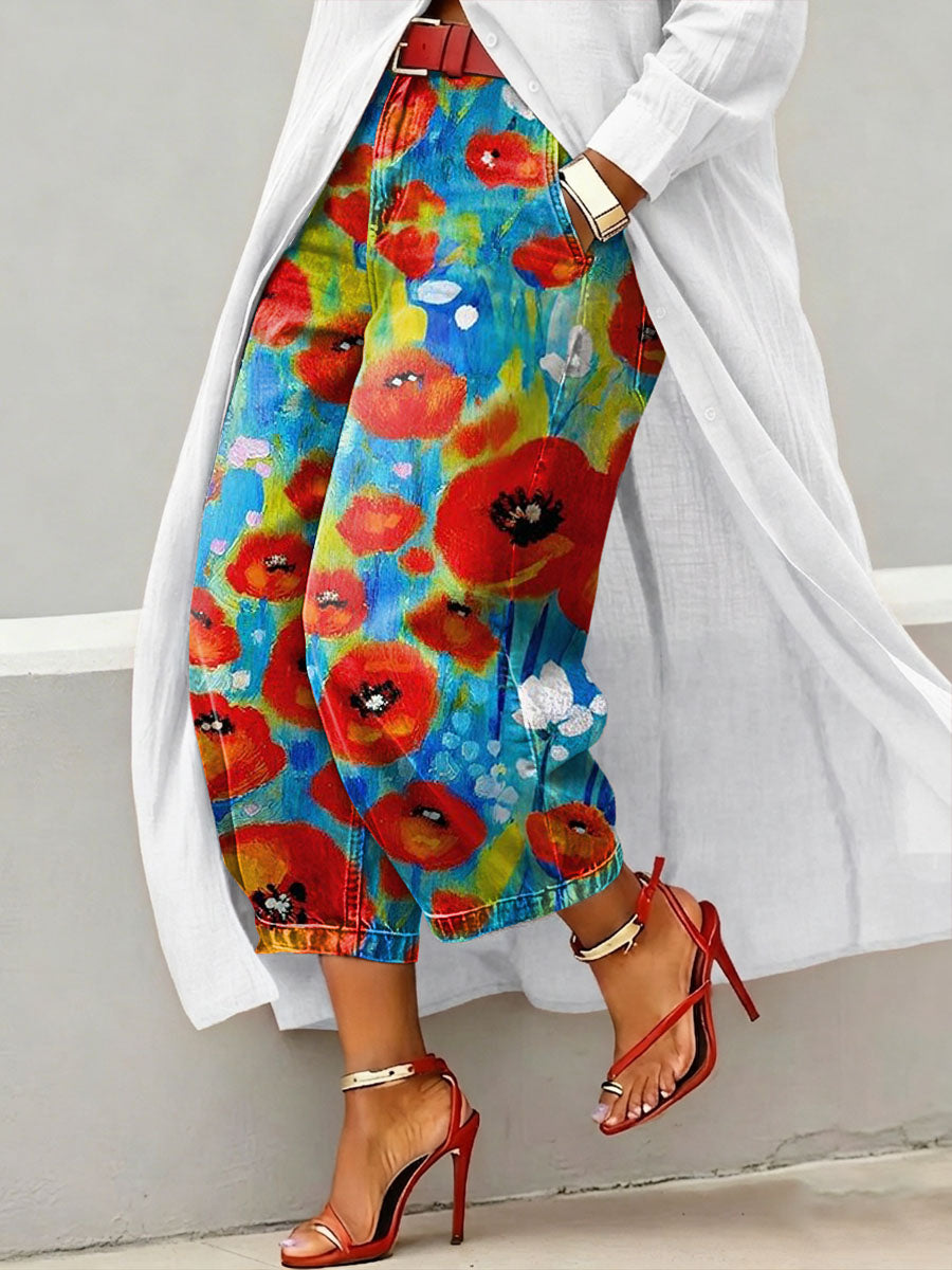 Women's Vintage Poppy Print Casual Jeans