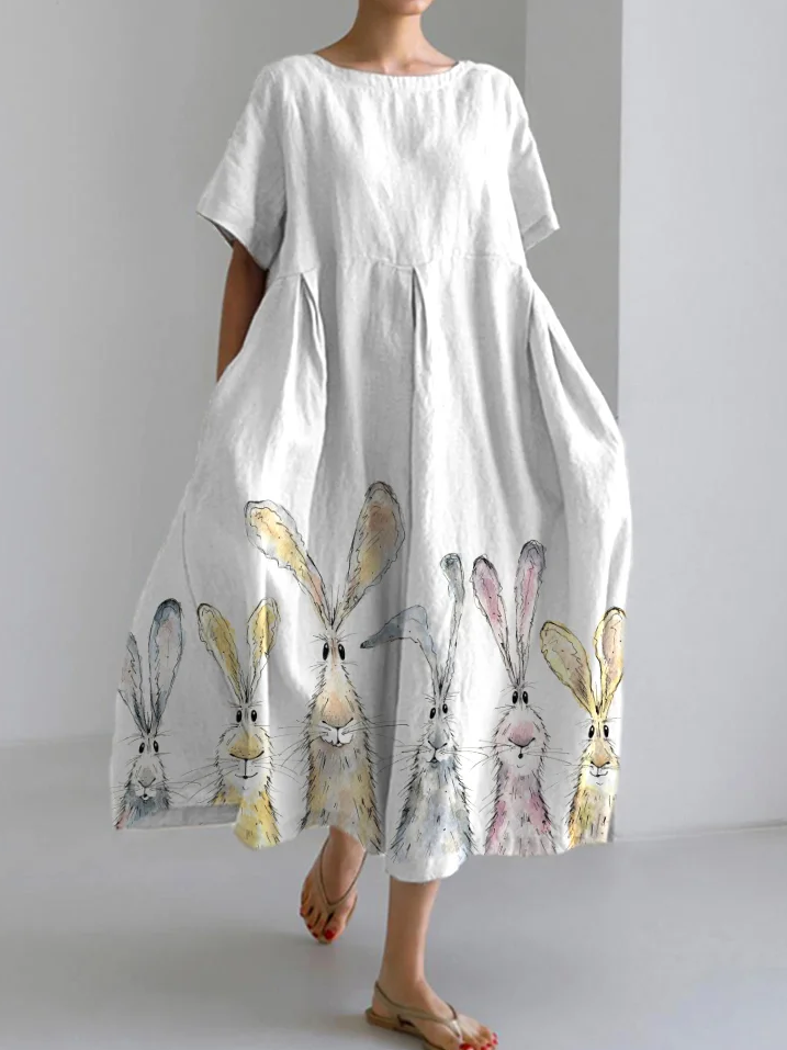 Watercolor rabbit print linen blend casual Dress With No Belt