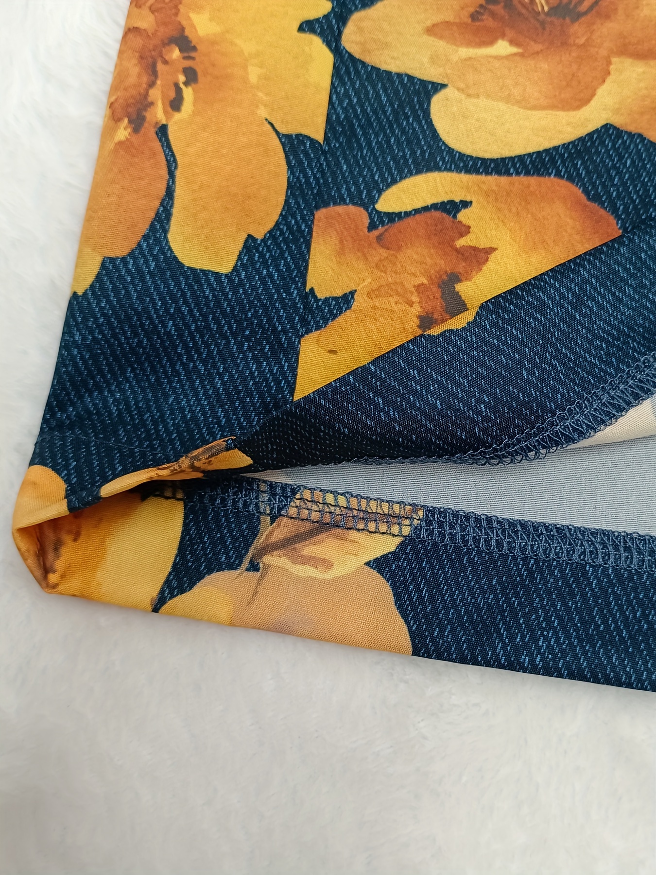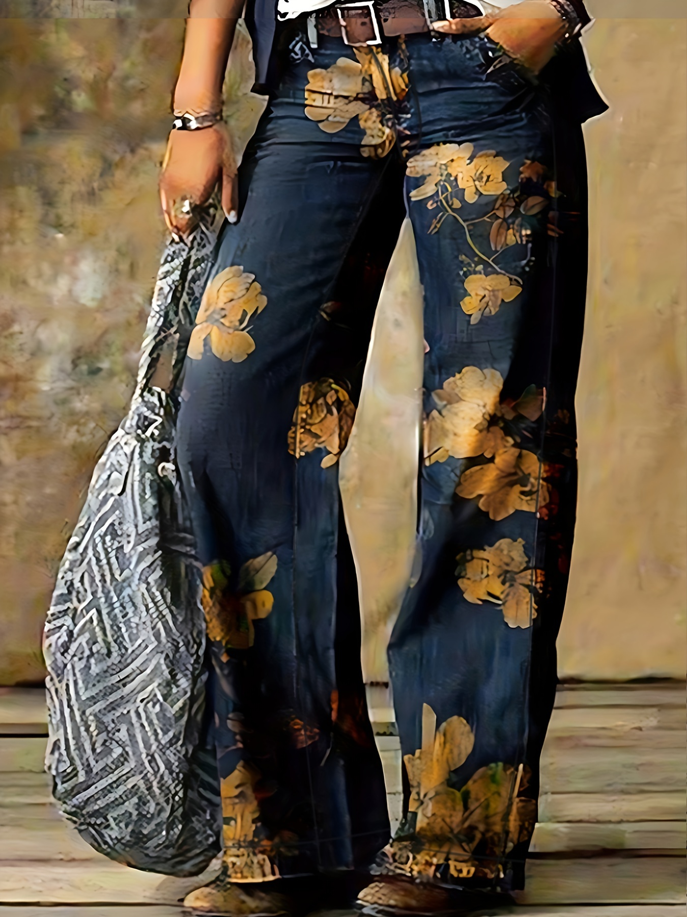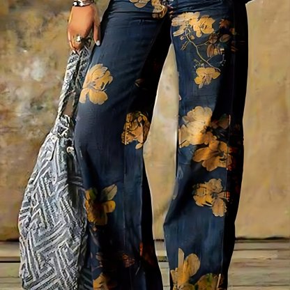 Plus Size Casual Pants, Women's Plus Floral Print Button Up Thin Straight Leg Pants