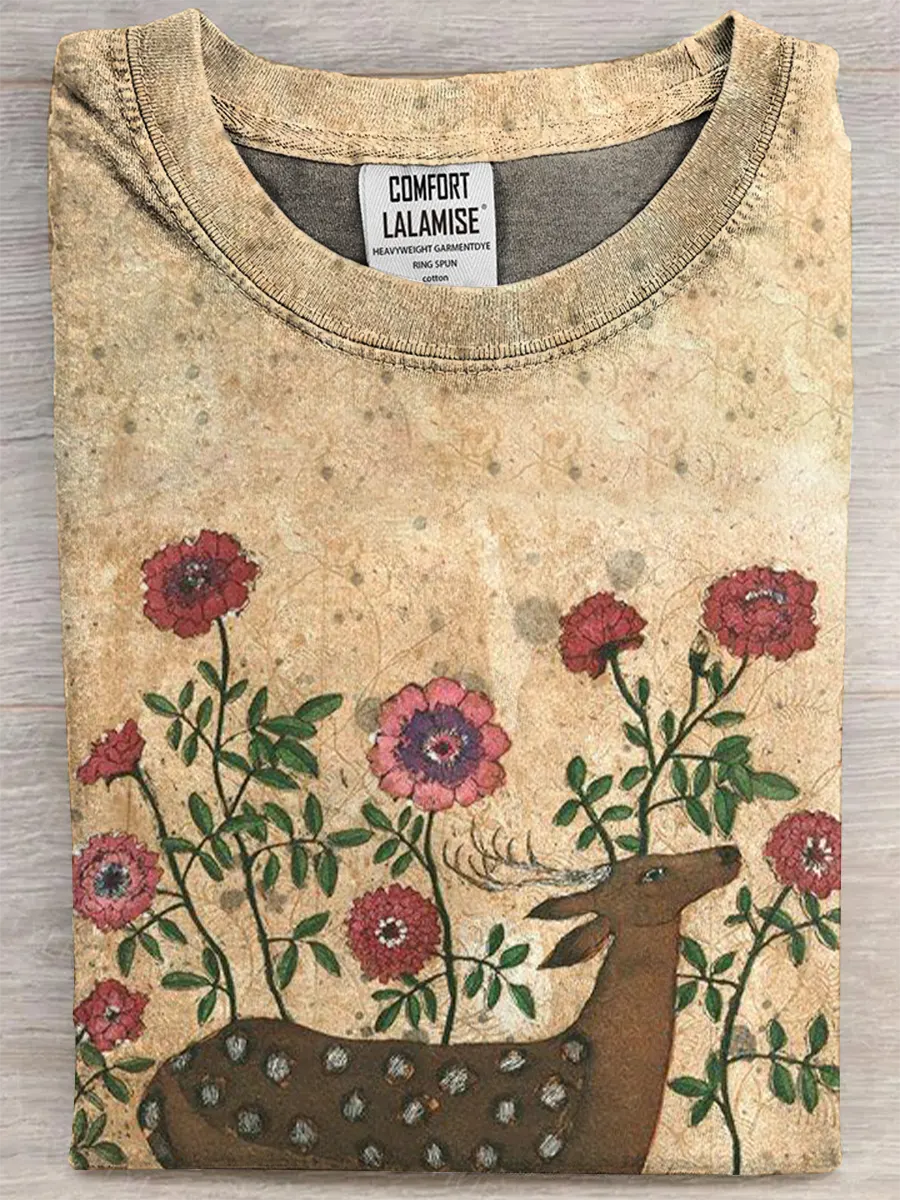 Retro Flowers Deer Art Print Casual Pure Cotton Short Sleeved T-shirt