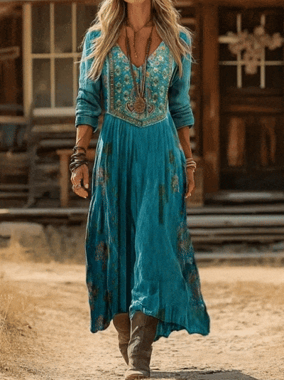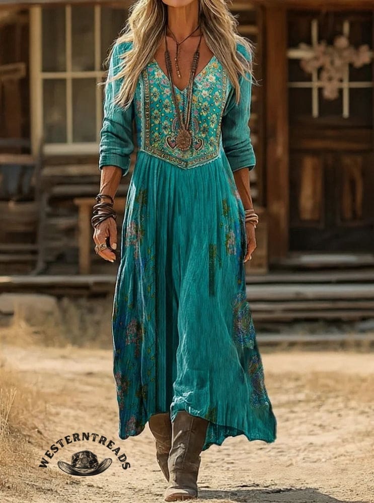 Vintage Print Casual V-neck Dress