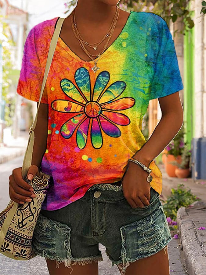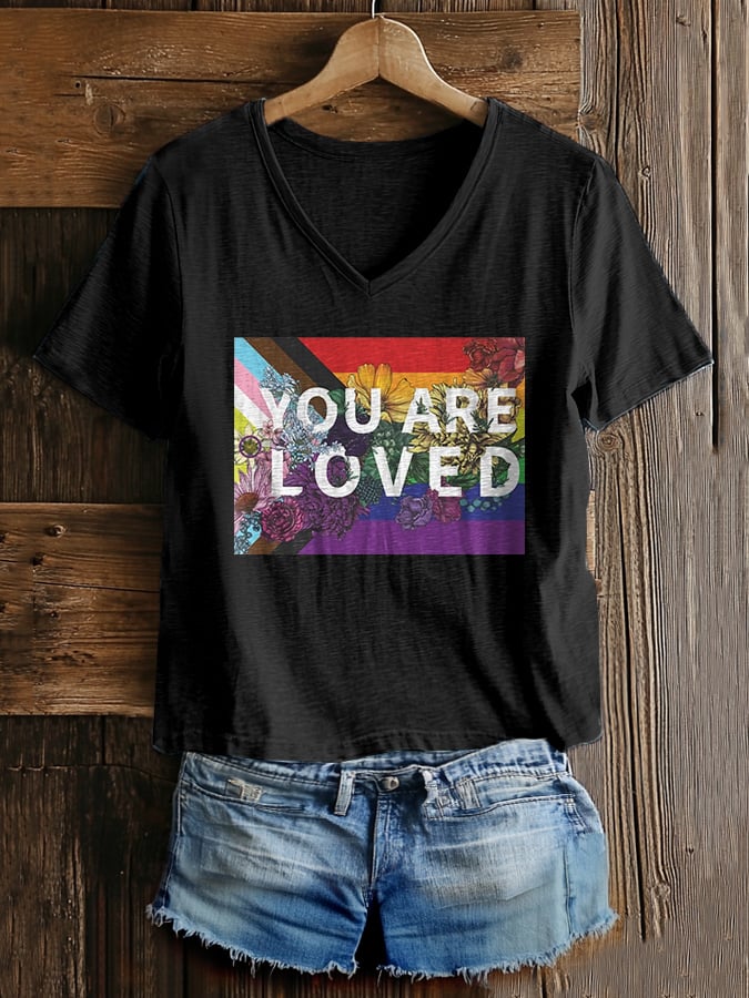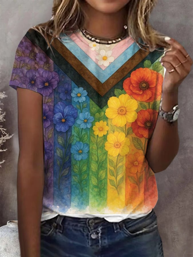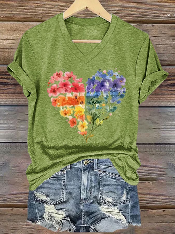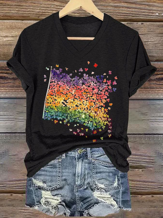 Women's Casual LGBT Rainbow Floral Flag Printed V-Neck Short Sleeve T-Shirt