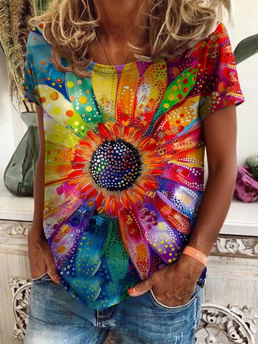 Women's Casual Rainbow Floral Cotton and Linen Bubble Wrinkle Top