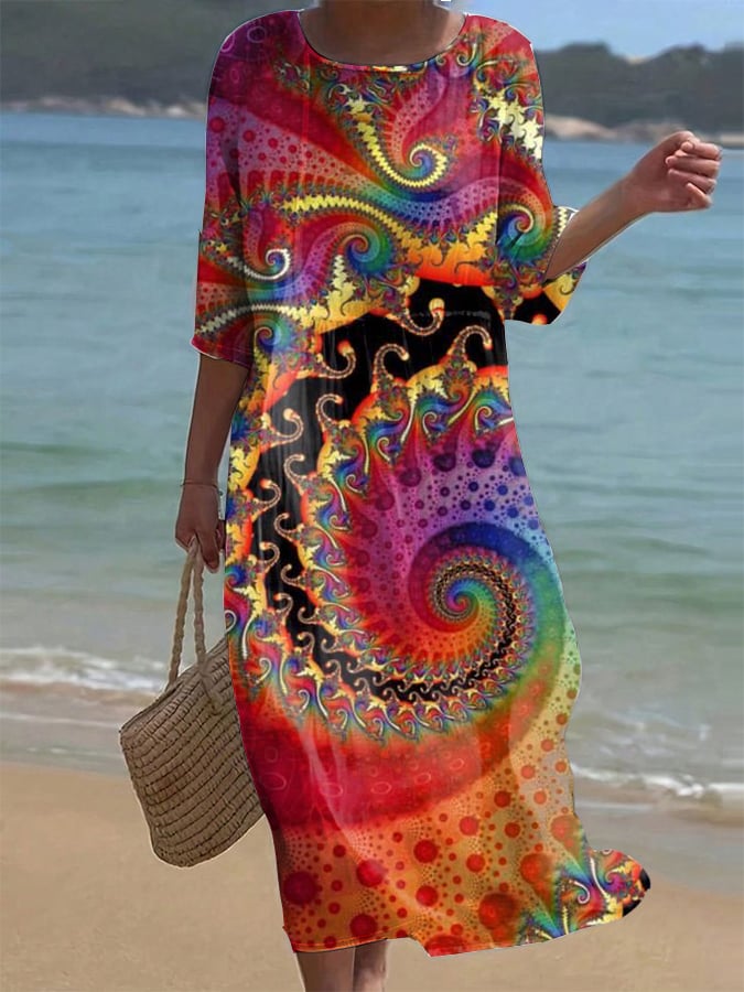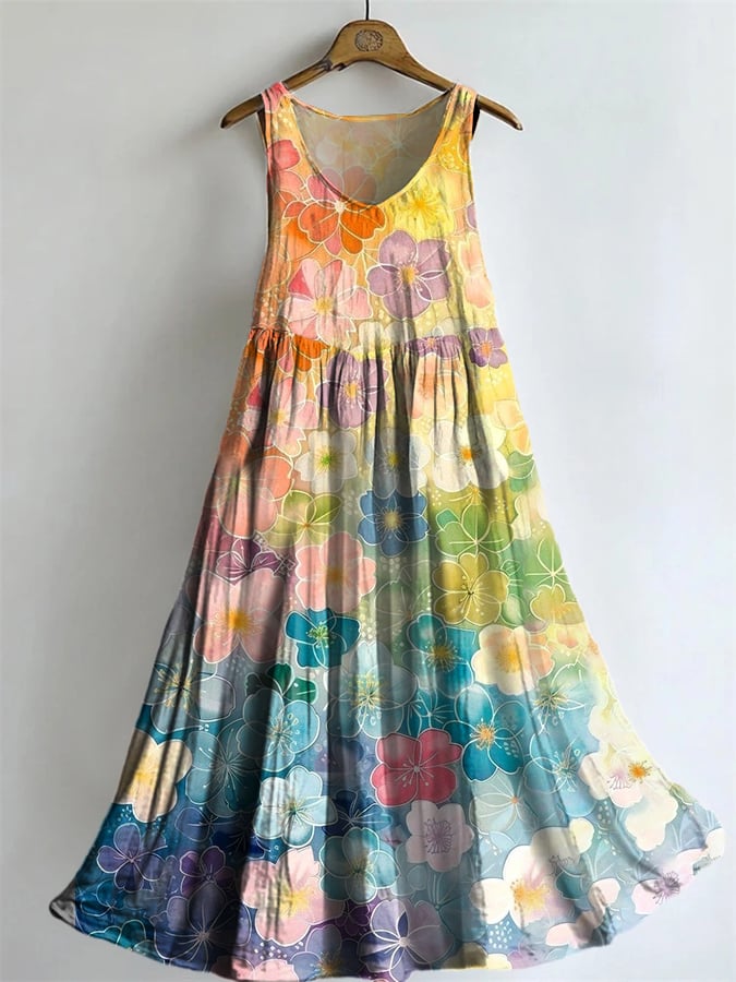 Women's Casual Cotton And Linen Rainbow Floral Dress