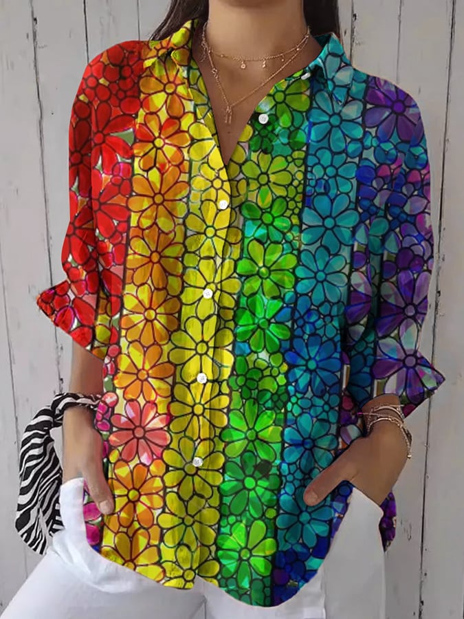Women's Casual Retro Rainbow Floral Art Cotton and Linen Shirt