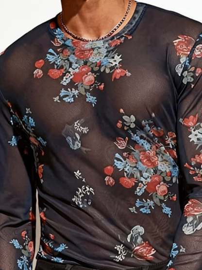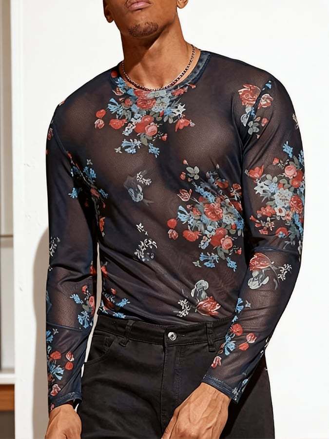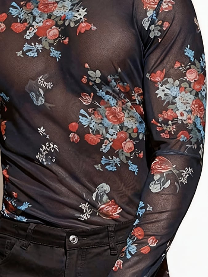 Men's Black Mesh Breathable Floral Print Stretch T-Shirt