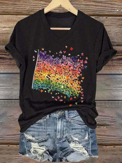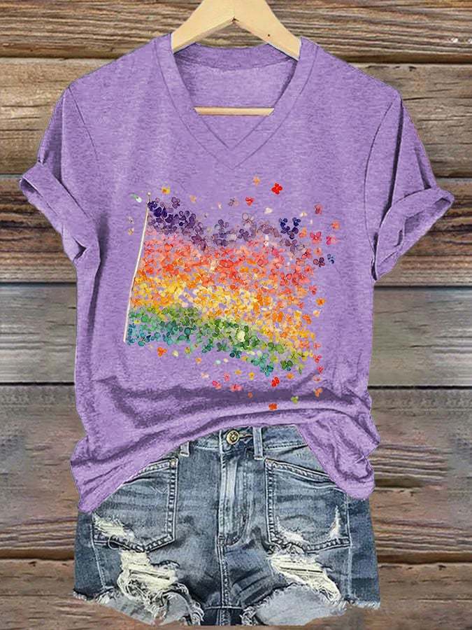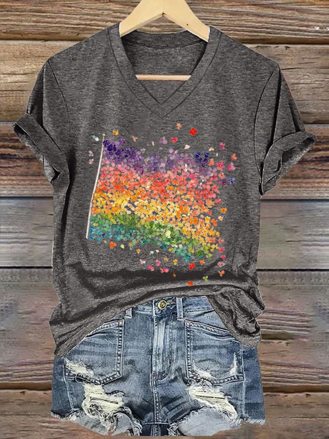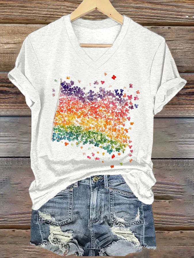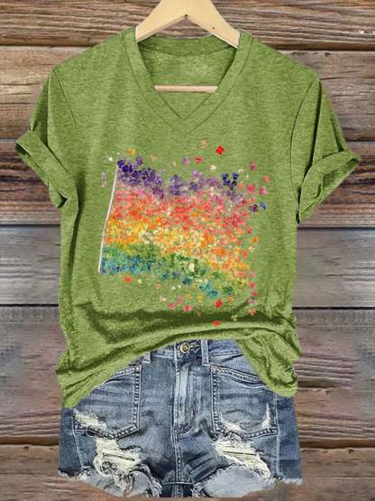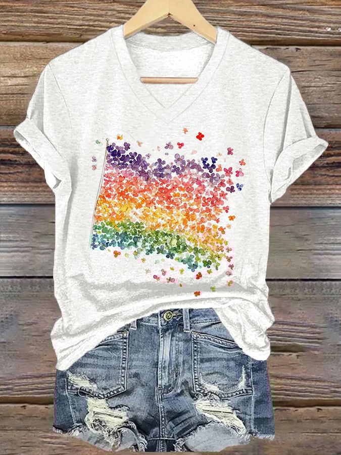 V-Neck Retro Pride Floral Flag Rainbow Pride Month Human Rights Equality Print T-Shirt