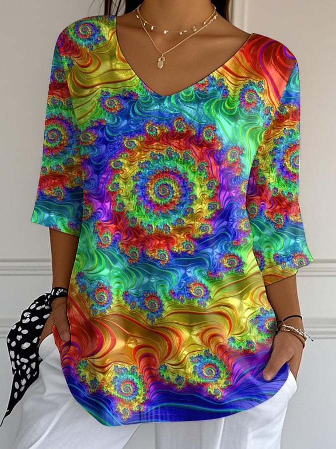 Women's Casual Fashion Rainbow Floral Print Bubble Wrinkle Cotton and Linen Top