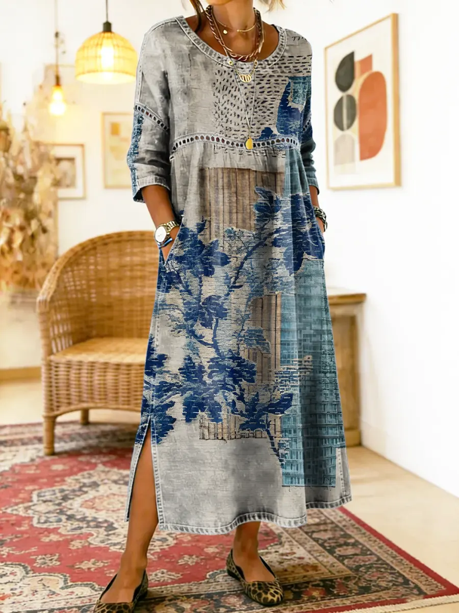 Women's Vintage Ethnic Floral Pattern Art Print Cotton Denim Dress With Lace Trim