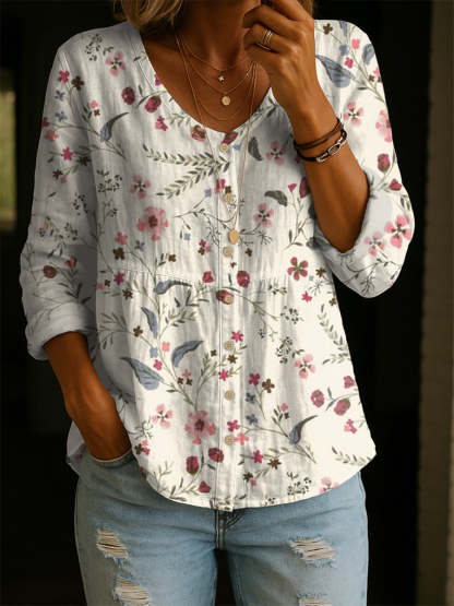 Women's Retro Flower Art Print Linen Cotton Shirt