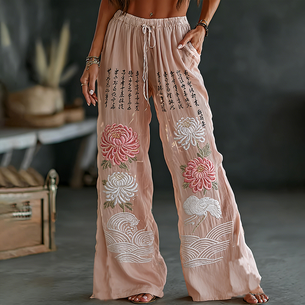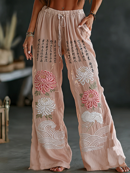 Japanese-style Chrysanthemum And Calligraphy Art Embroidered Pink Cotton-linen Casual Trousers – lolonb